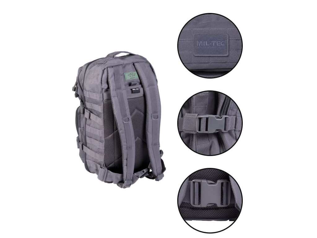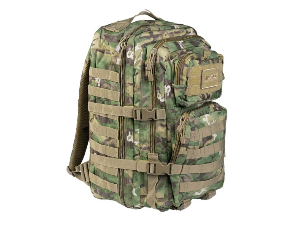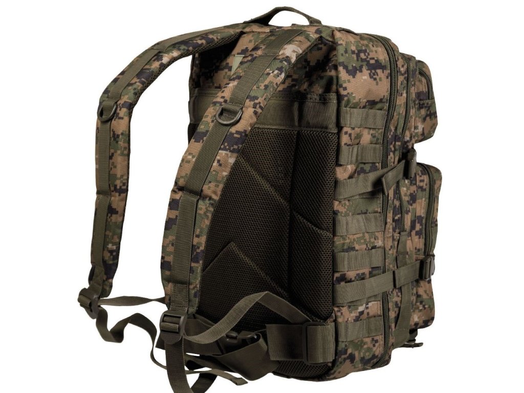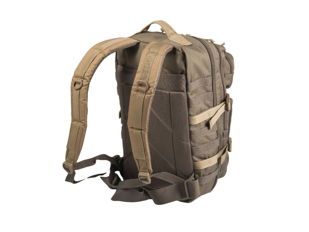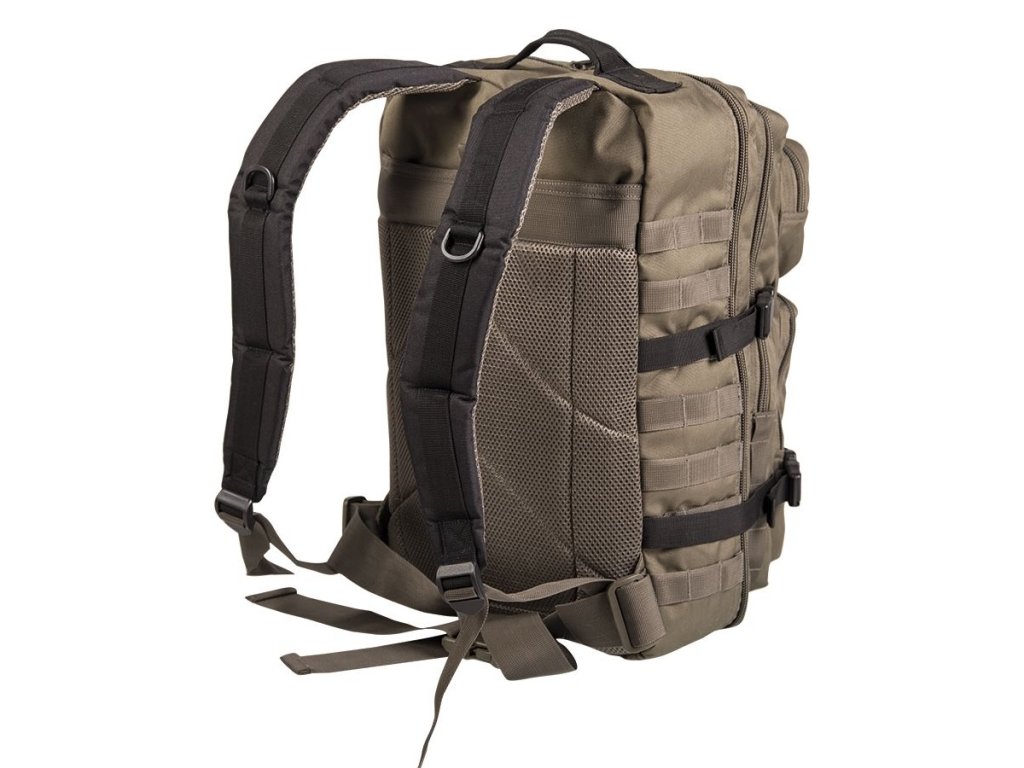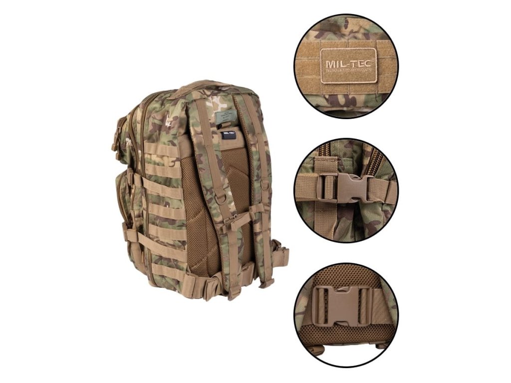 Batoh ASSALUT je odolný proti vode s objemom cca 36l. Všetky priestory sú uzavreté robustným 2-pásmovým zipsom. Ergonomicky tvarované ramenné popruhy sú polstrované a nastaviteľné. Polstrovaný chrbát s nastaviteľným popruhom okolo pása. Vďaka rade bočných kompresných popruhov dáva možnosť pripojiť ďalšie zariadenia prostredníctvom nylonových popruhov MOLLE a D-krúžkov. Batoh je ideálny pre vojsko, táborenie aj turistiku.