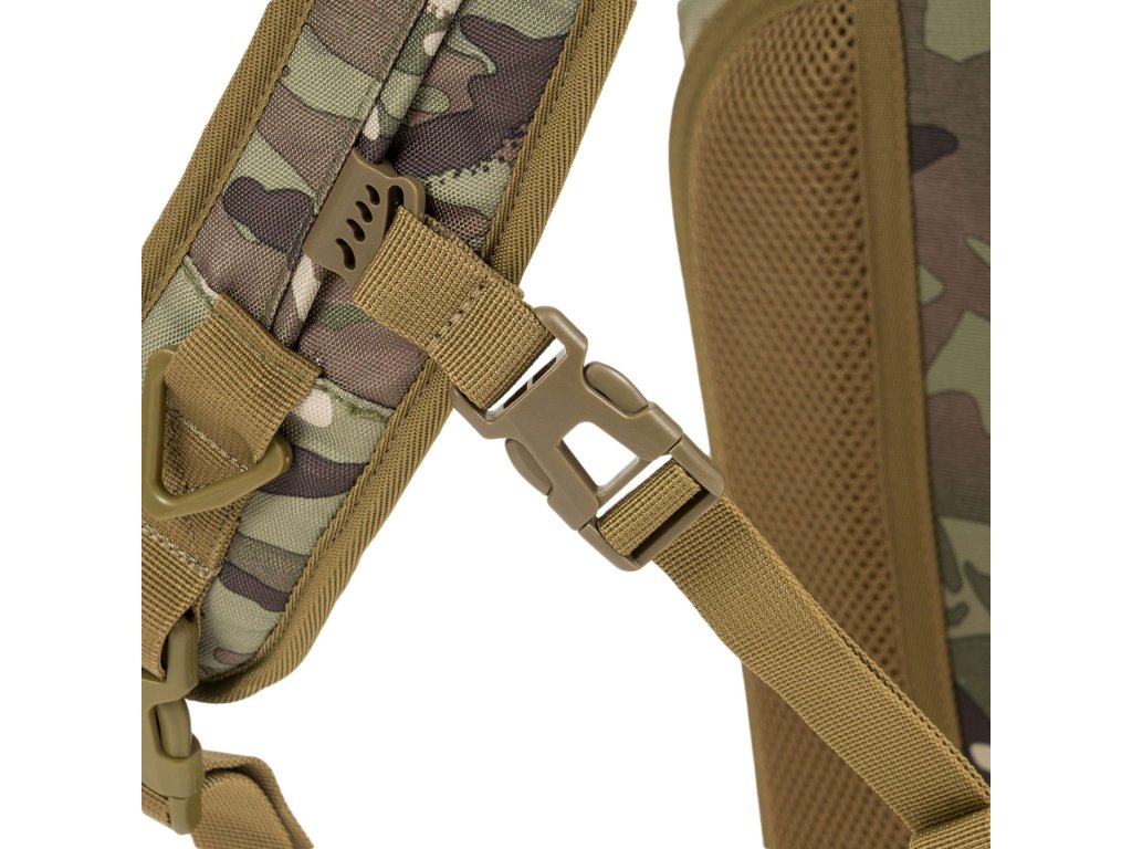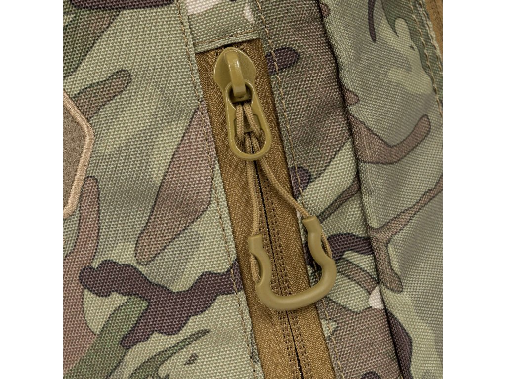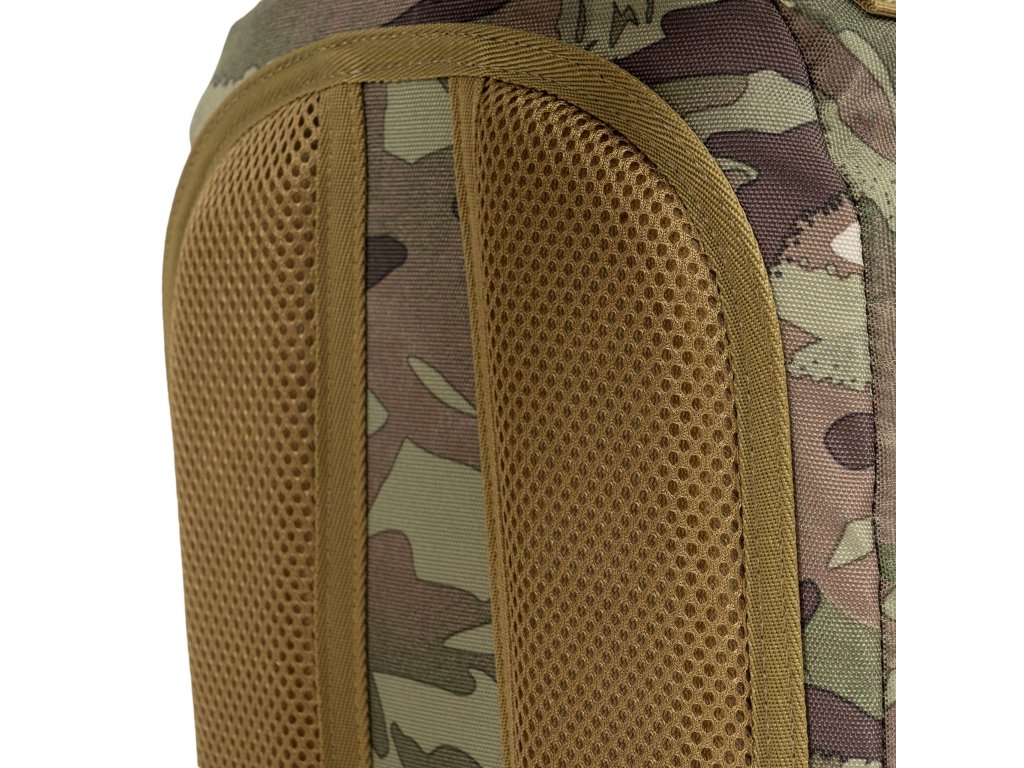 Chrbát plecniaka je bohato polstrovaný pomocou 3D sieťoviny. Nosný popruh nastaviteľný, vybavený plastovým trianglom a malým, výškovonastaviteľným stabilizačným popruhom spínaným prackou. Na bokoch batohu nájdete elastické vrecká na fľaše a drobnejšie vybavenie. Horná časť je vybavená madlom na prenášanie. Vpredu nájdete dva rady MOLLE/PALS väzby, dva VELCRO panely a horné vrecko na dokumenty. Hlavný úložný priestor je prístupný cez dvojcestný zips. Vnútri sa nachádza malé odopínateľné vrecko, priehradka s elastickým okrajom na hydratačný vak a veľké vrecko zo sieťoviny.