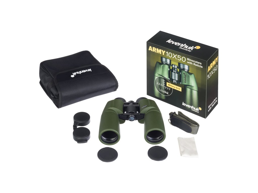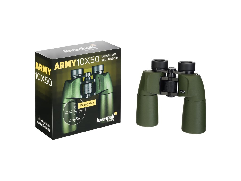 Optika ďalekohľadu Levenhuk Army 10x50 je vyrobená z vysoko kvalitného skla BaK-4 s antireflexnou vrstvou na všetkých optických prvkoch. To produkovanému obrazu poskytuje vysoký kontrast a jas. Stredové zaostrovacie koliesko je veľké a ľahko sa otáča aj s rukou v rukavici. Na prispôsobenie optiky stavu svojho zraku môžete použiť krúžok dioptrickej korekcie a nastaviteľné očnice. V prípade potreby môžete pozorovanie vykonávať pohodlne aj s taktickými alebo slnečnými okuliarmi.