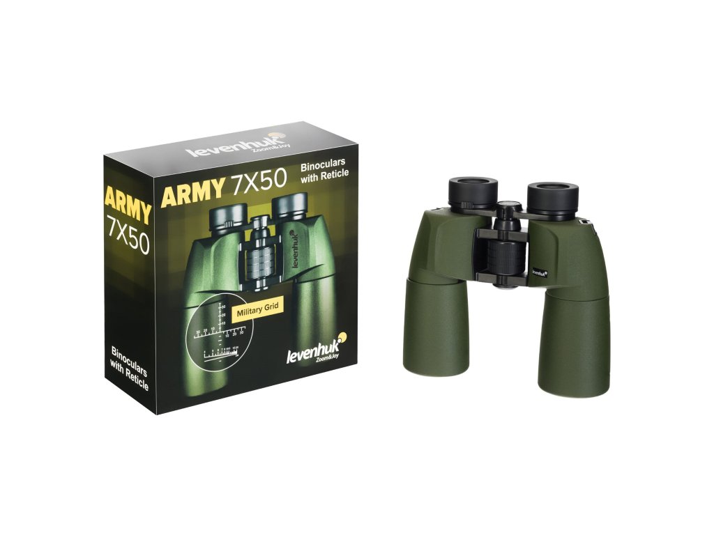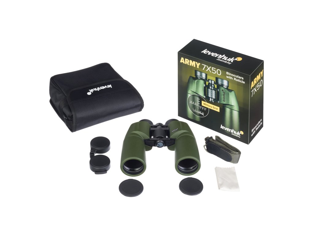 Binokulárny ďalekohľad so zameriavačom Levenhuk Army 7x50 je optický prístroj s vysokou svetelnosťou, ktorého funkčnosť ocenia lovci, turisti, rybári i vodáci. Je tiež vynikajúci na profesionálne použitie, napr. v geodézii či pri ochrane územia. S týmito binokulárnymi ďalekohľadmi môžete pozorovať krajinu a vzdialené ciele pri 7x zväčšení alebo vykonávať rôzne merania. Meradlá v okuláre ďalekohľadu umožňujú stanoviť výšku objektu, vzdialenosť k nemu, horizontálny uhol a výškový uhol.