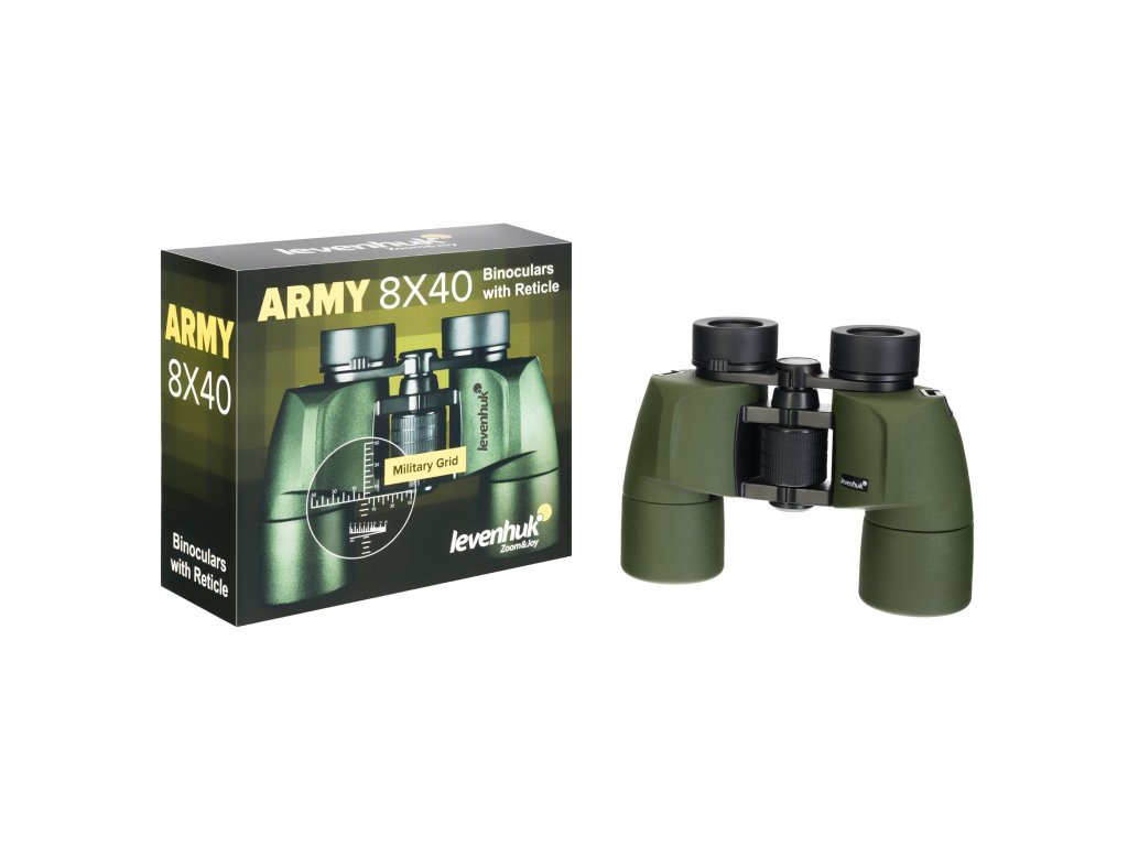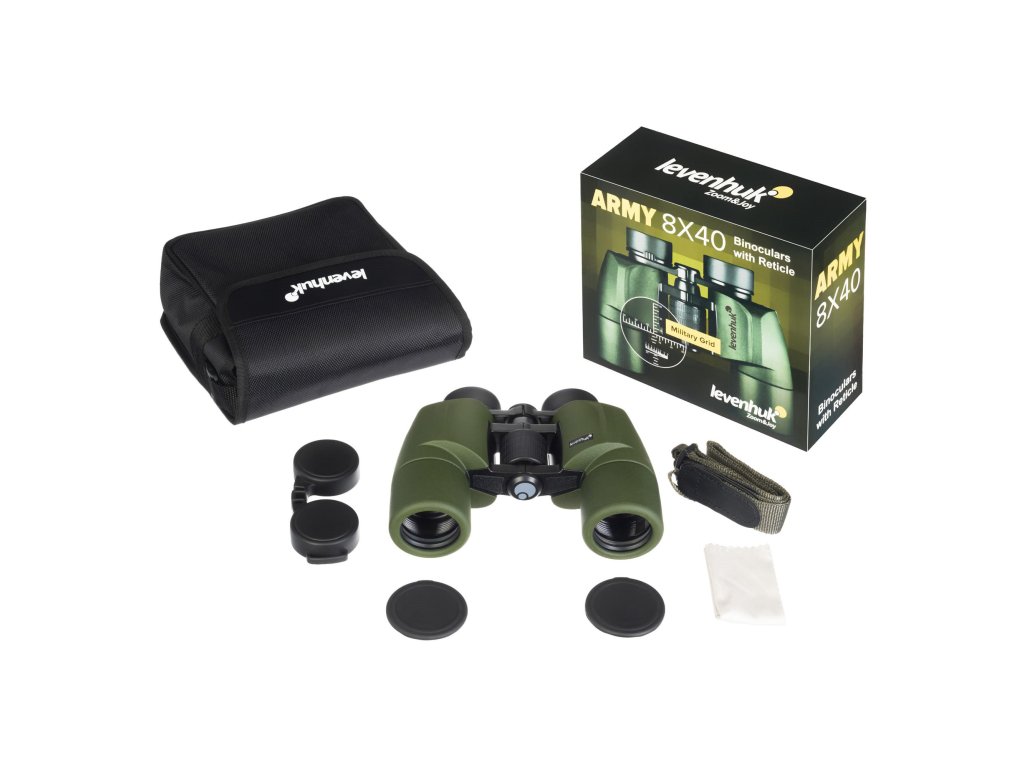 Levenhuk Army 8x40 – poľný ďalekohľad s meradlom, ktoré sa skvele hodí pre lov, extrémnu turistiku, taktické a bezpečnostné aplikácie a geodéziu. Prístroj disponuje až 10x zväčšením a je možné ho využiť na prieskum terénu, vyhľadávanie vzdialených cieľov, meranie vzdialeností, výšok aj horizontálnych a vertikálnych uhlov. To je možné vďaka rastrovému zámernému krížu a mierke na meranie vzdialenosti v jednom z okulárov ďalekohľadu.