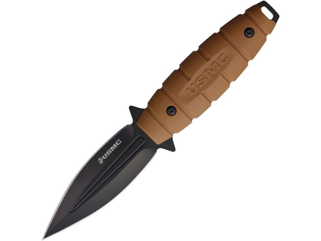 Oficiálne licencovaná dýka USMC s plnou čepeľou. Obojstranná brúsená a černená čepeľ s hladkým ostrím je vyrobená z nehrdzavejúcej ocele. Na oboch stranách čepele sa v spodnej časti noža nachádza kovová ochrana, ktorá chráni pred náhodným poranením. Rukoväť je tvarovaná pre pevný úchop a jej šupiny sú vyrobené z nylonu. Na konci rukoväti je otvor na prevlečenie bezpečnostnej šnúry. Nôž je dodávaný s plastovým puzdrom.