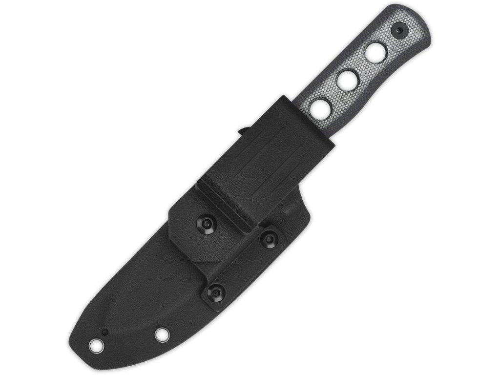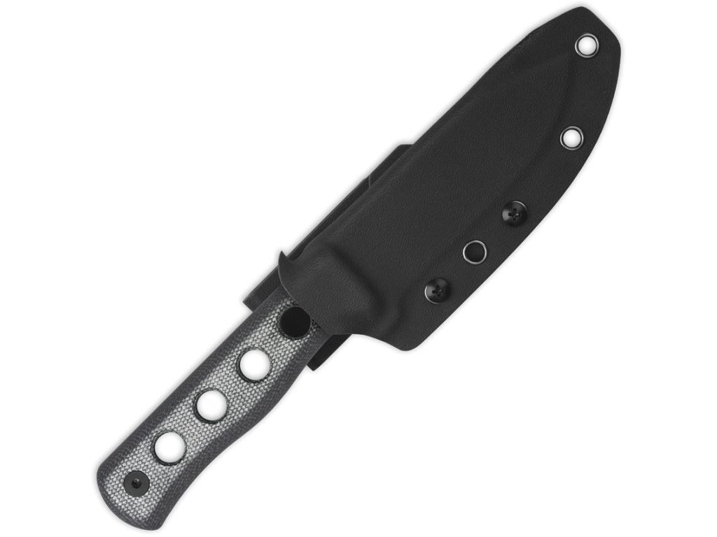 K nožu je dodávané čierne opaskové kydexové puzdro s celkom piatimi otvormi pre montáž klipu podľa požiadaviek užívateľa.