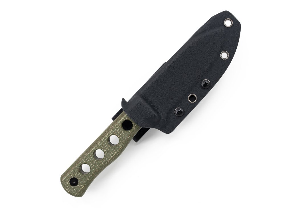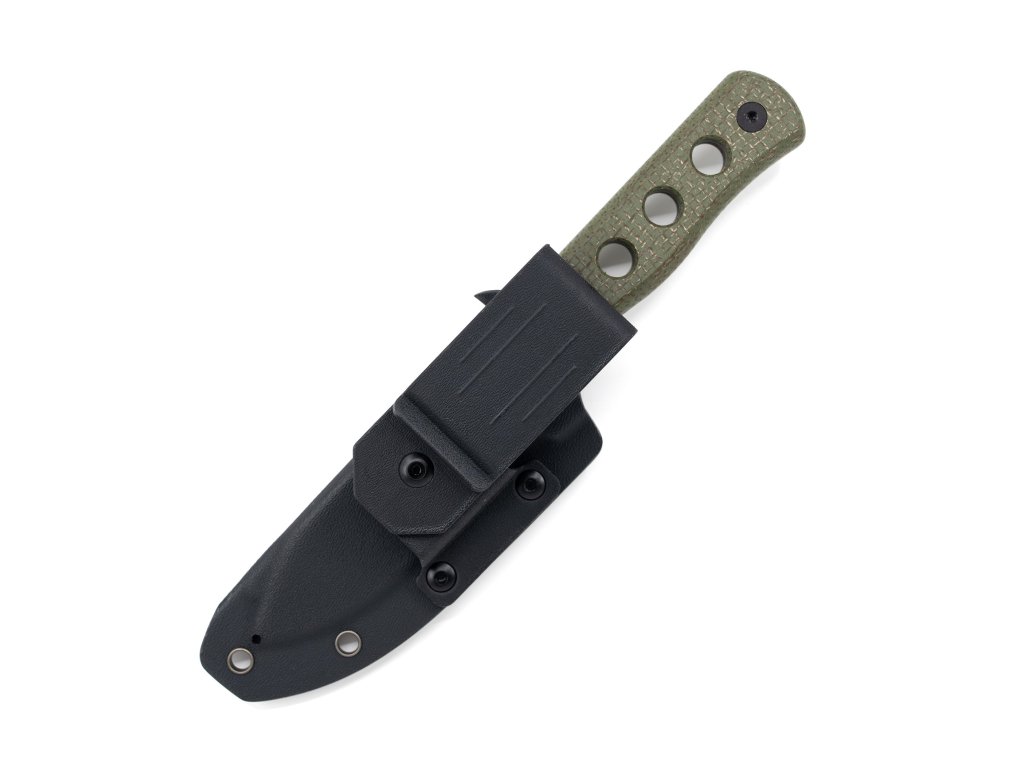 K nožu je dodávané čierne opaskové kydexové puzdro s celkom piatimi otvormi pre montáž klipu podľa požiadaviek užívateľa.