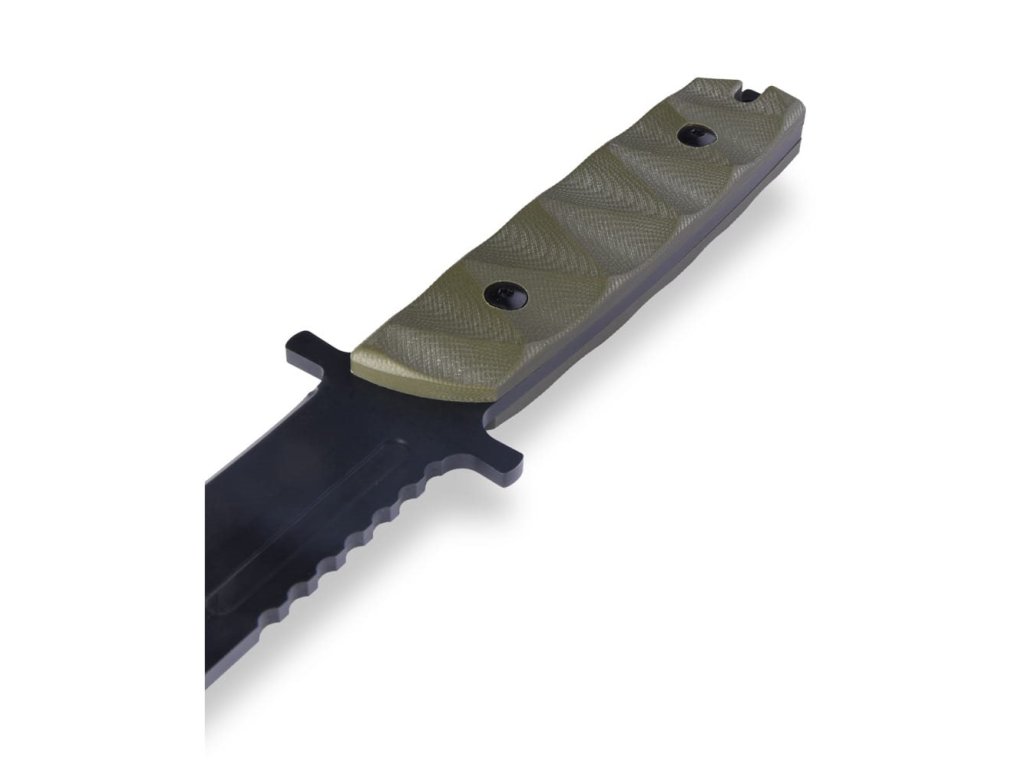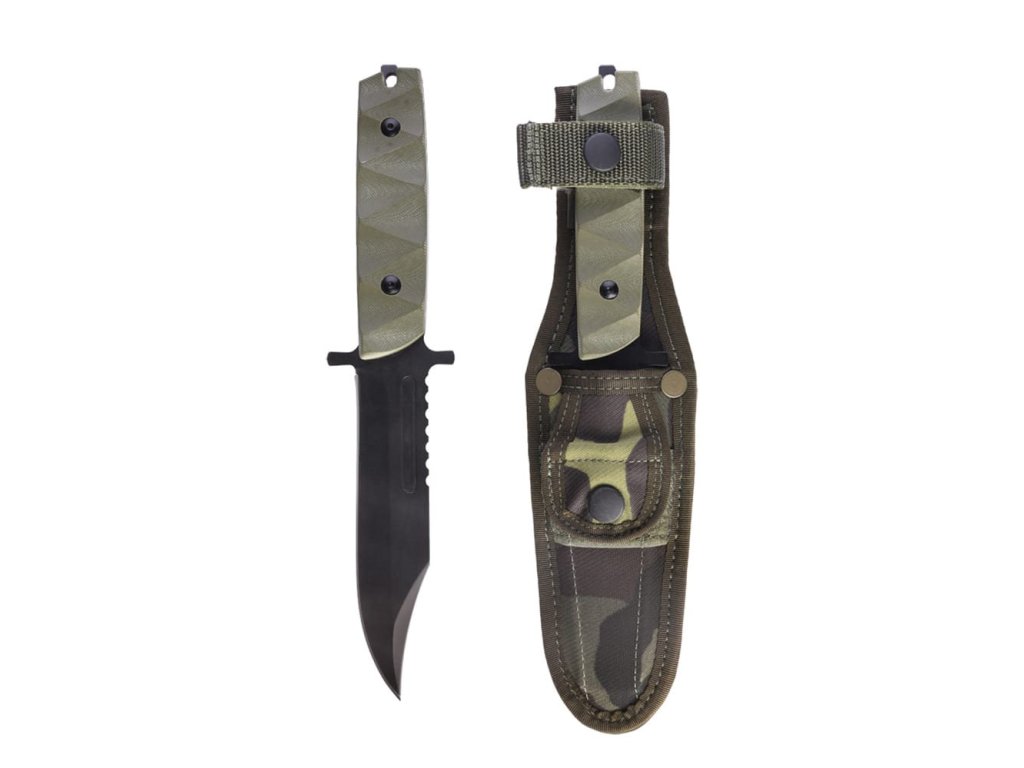 Odolný full-tang nôž s čiernenou čepeľou a maskovaným vz.95 opaskovým puzdrom. Čepeľ s hladkým ostrím je vyrobená z nerezovej ocele 420 a disponuje oceľovou záštitou chrániacou pred nechceným poranením. CNC rukoväť v zelenej farbe je opatrená jemnou protišmykovou textúrou pre pohodlný úchop a otvorom na prevlečenie poistnej šnúry. Maskované puzdro je vyrobené z odolného materiálu, disponuje istením pomocou cvoku a malým predným vreckom.