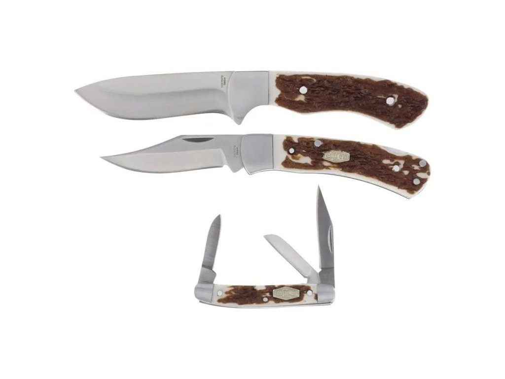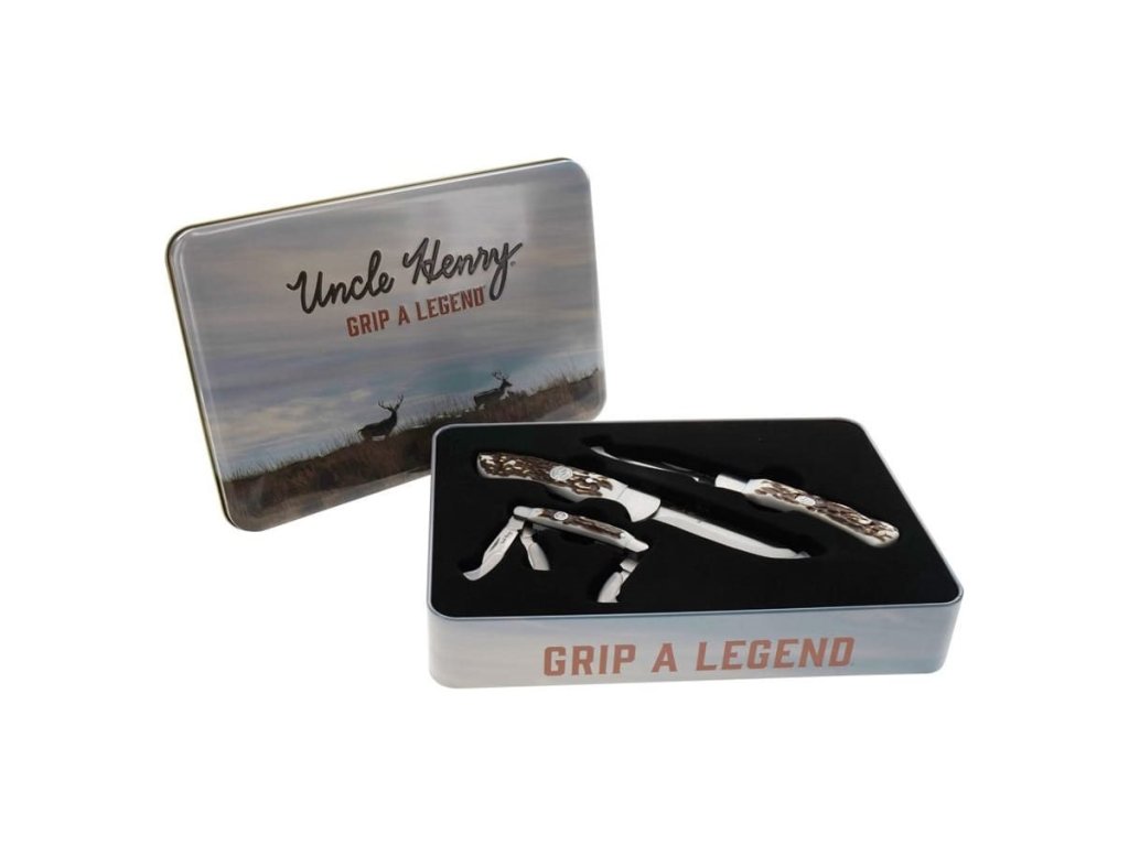 Sada troch nožov z nehrdzavejúcej ocele dodávaná v darčekovej krabičke z nehrdzavejúcej ocele. Všetky tri nože majú štýlovú rukoväť z Delrinu, ktorá svojím vzhľadom pripomína roh. Sada obsahuje nôž s pevnou čepeľou, skladací nôž a univerzálny nôž.