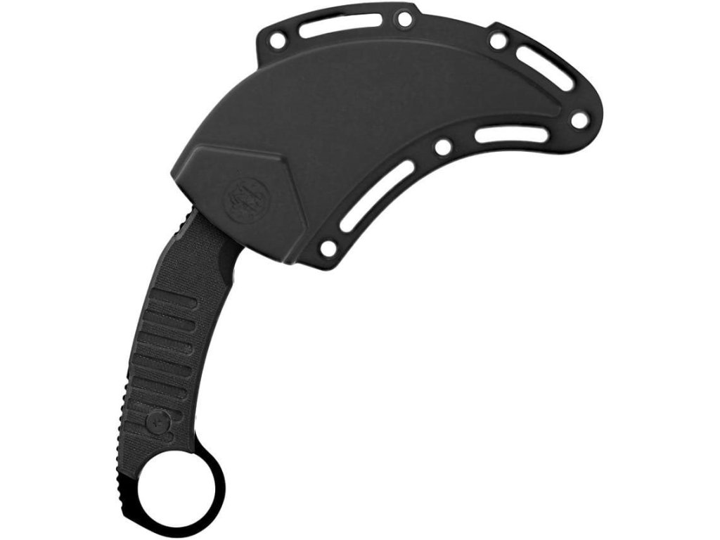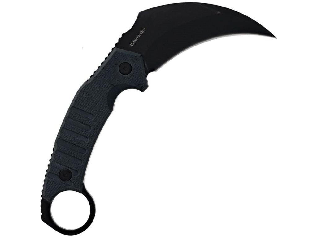 Taktický karambit v celočiernom prevedení s predĺženým tangom. Typicky zakrivená hawkbill čepeľ je vyrobená z nerezovej ocele a je pokrytá výrazným čiernením zabraňujúcim tvorbe nechcených odleskov. Rukoväť je mierne zakrivená a na jej konci nájdete istiaci otvor na vloženie prsta. Črienky sú zo syntetického materiálu G10, čo je nylon zosilnený pomocou sklených vlákien. K nožu je dodávané čierne opaskové puzdro vyrobené z ABS plastu.