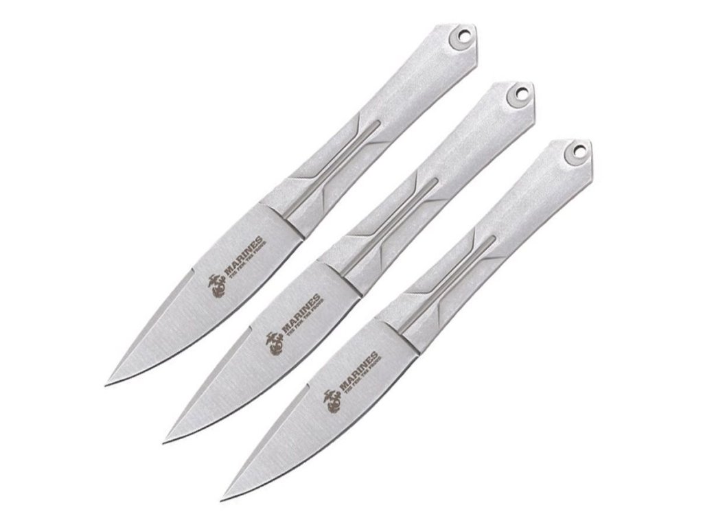 Sada troch dokonale vyvážených nožov z nehrdzavejúcej ocele s oficiálne licencovaným logom USMC. Nože sú vyrobené z jedného kusu nehrdzavejúcej ocele s povrchovou úpravou stonewash. Čepele sú hladké a ich špičky sú extra úzke pre maximálnu penetráciu. Na konci každého noža nájdete otvor na prevlečenie bezpečnostnej šnúry. Sada je dodávaná s nylonovým puzdrom na opasok so zapínaním na patentky.