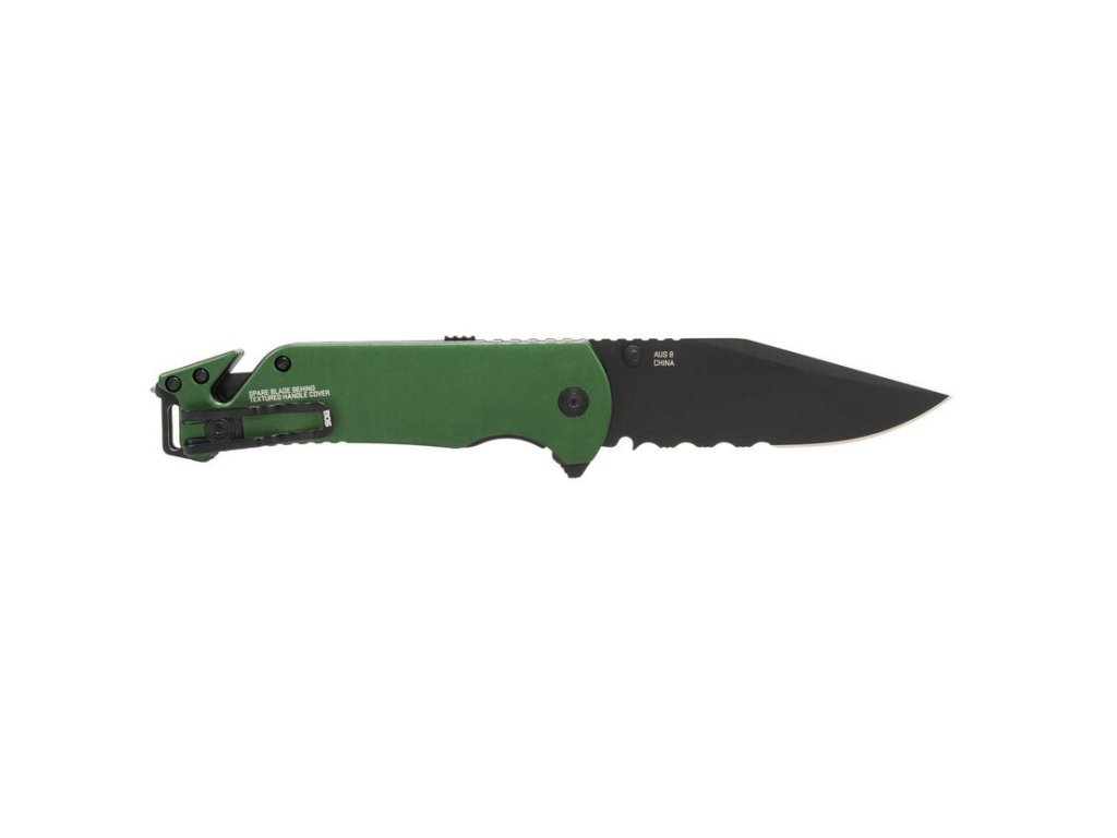 Záchranársky zatvárací nôž s čiastočne zubatým ostrím, rozbíjačom skla a rezačom pásov.
