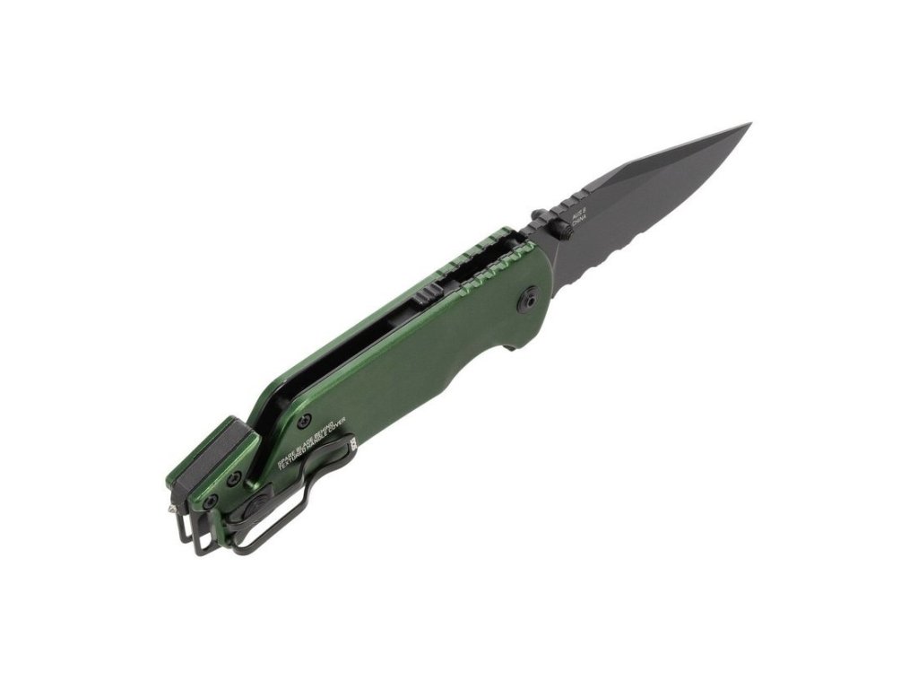 Tvar čepele je klasický Clip Point s plochým výbrusom a zubami v zadnej časti ostria. Vyrobená z ocele AUS8 a čiernou povrchovou úpravou.