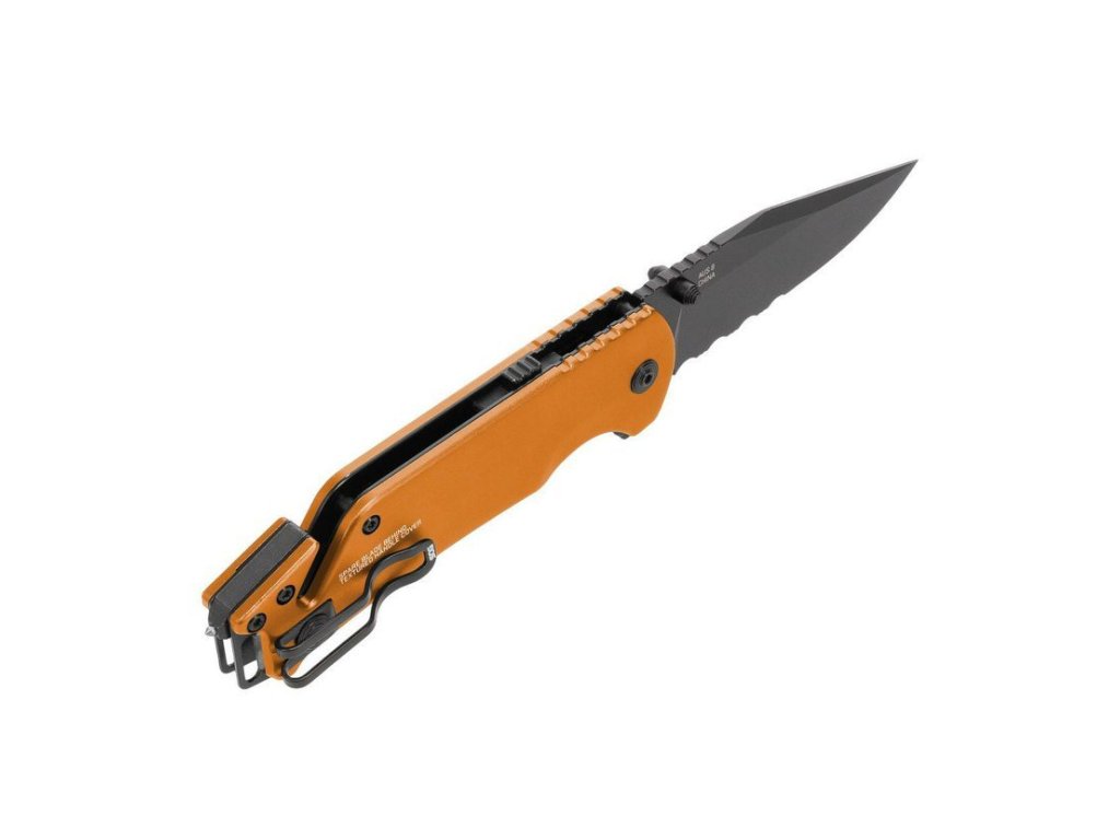 Záchranársky zatvárací nôž s čiastočne zubatým ostrím, rozbíjačom skla a rezačom pásov.