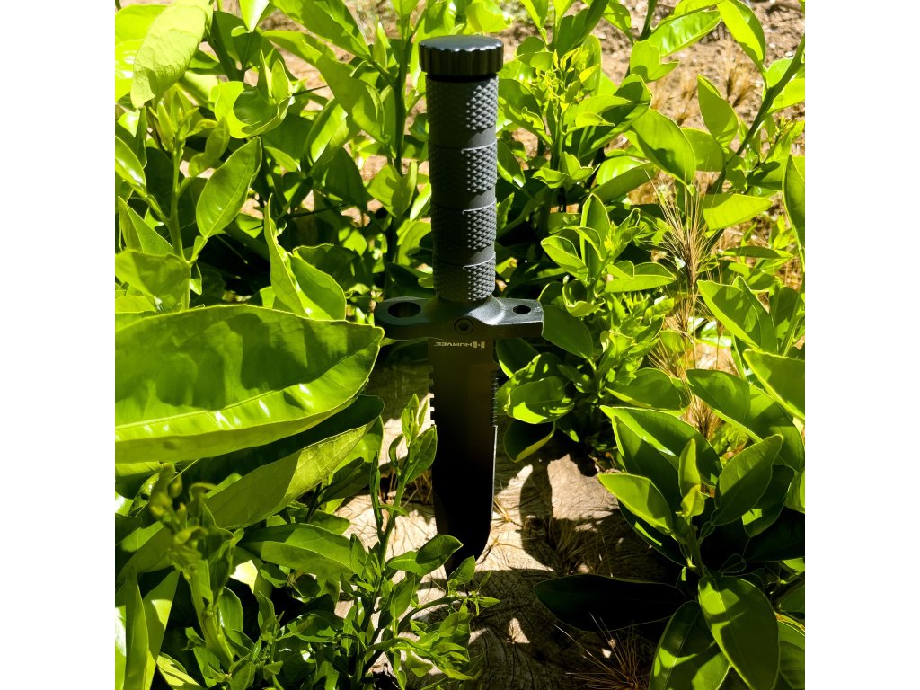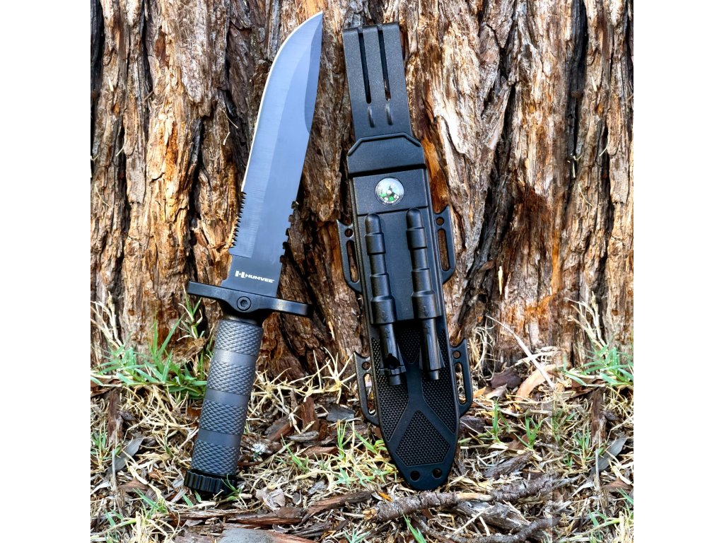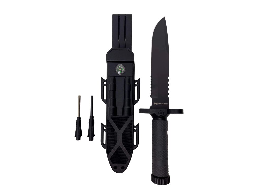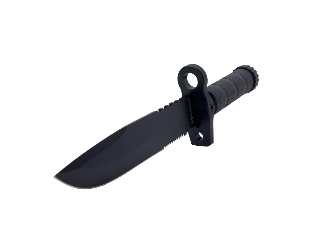Survival nôž s pevnou čepeľou a doplnkovým príslušenstvom. Čepeľ s kombinovaným ostrím je vyrobená z nerezovej ocele s čiernym povlakom. Masívna oceľová záštita disponuje otvorom pre hlaveň pušky a zároveň chráni pred skĺznutím ruky a nechceným poranením. Pogumovaná rukoväť je protišmyková a umožňuje pevný a istý úchop v akejkoľvek situácii. Na konci rukoväte nájdete plochu použiteľnú na zatĺkanie klincov. K nožu je dodávané nylonové puzdro s integrovaným kompasom, kresadlom a píšťalkou.