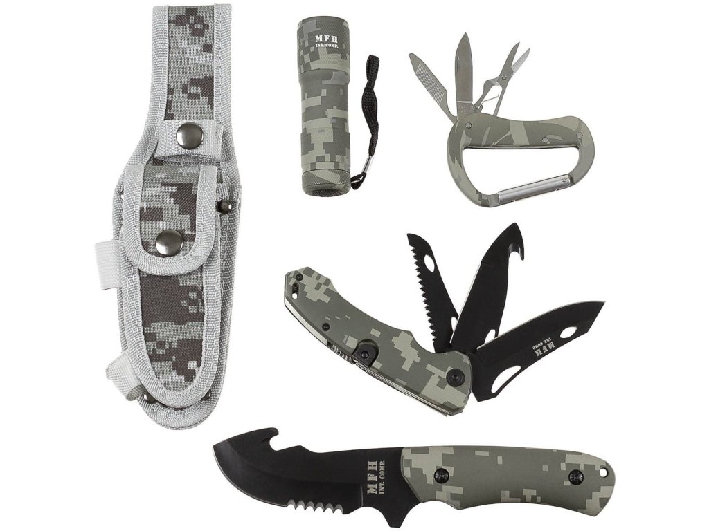 Nôž s pevnou čepeľou + zatvárací nôž + baterka + karabína ACU DIGITAL