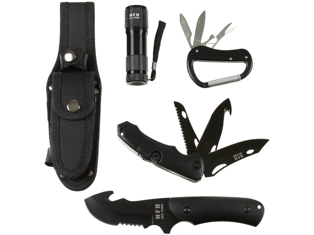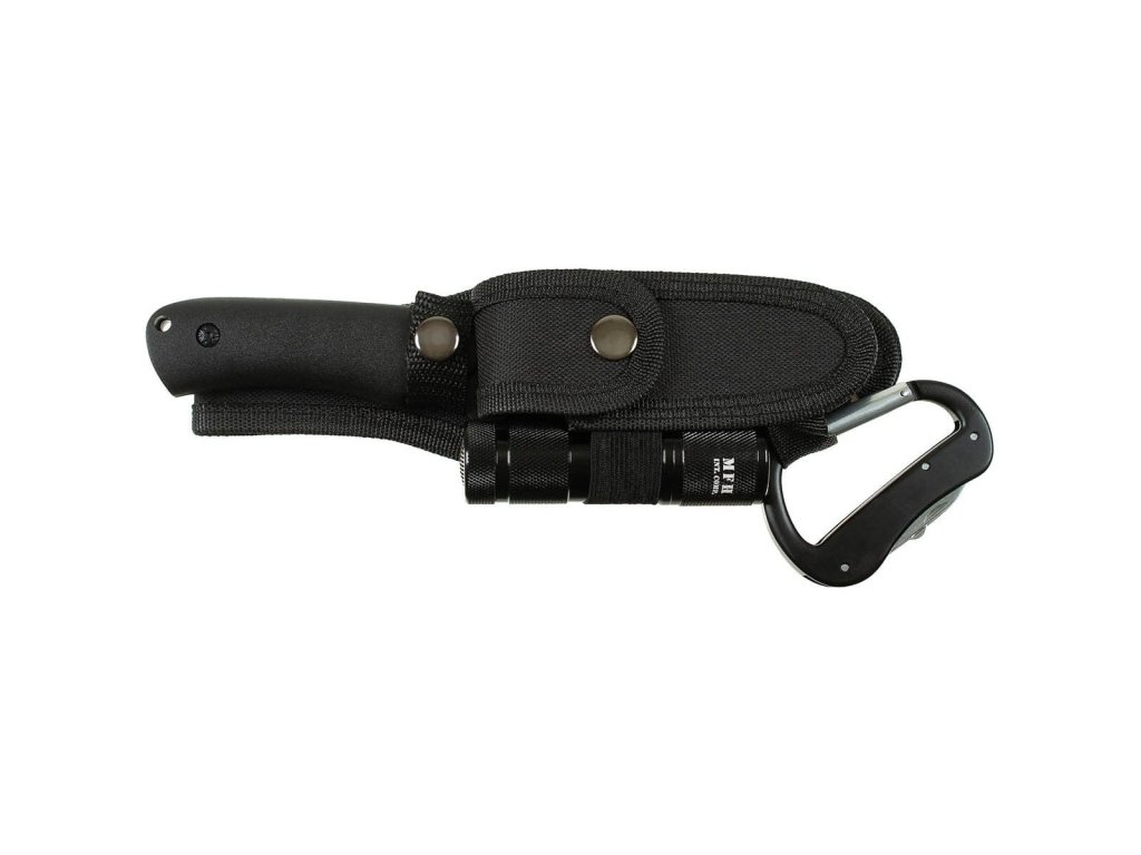 Nôž s pevnou čepeľou + zatvárací nôž + baterka + karabína ČIERNY