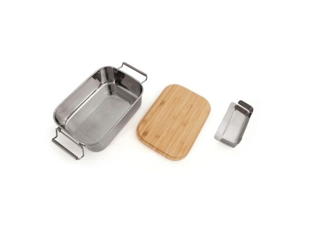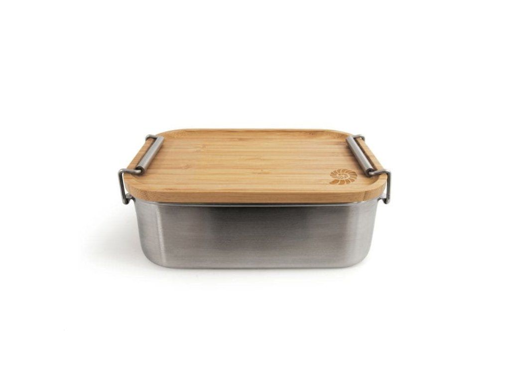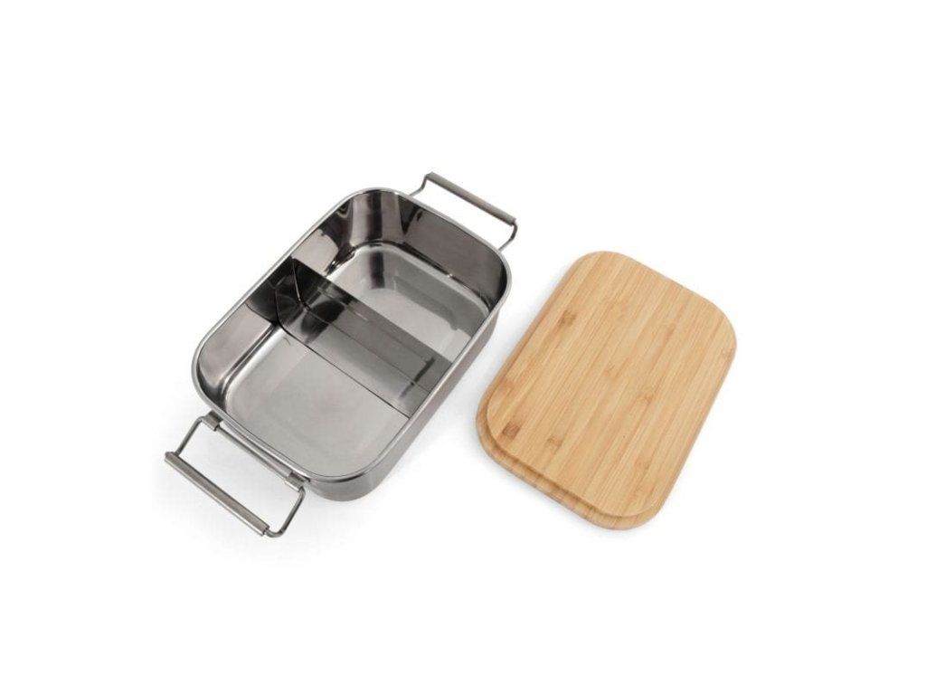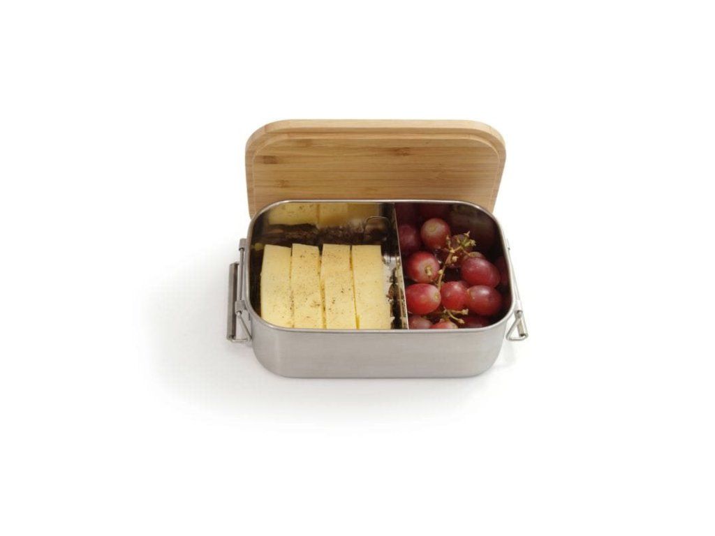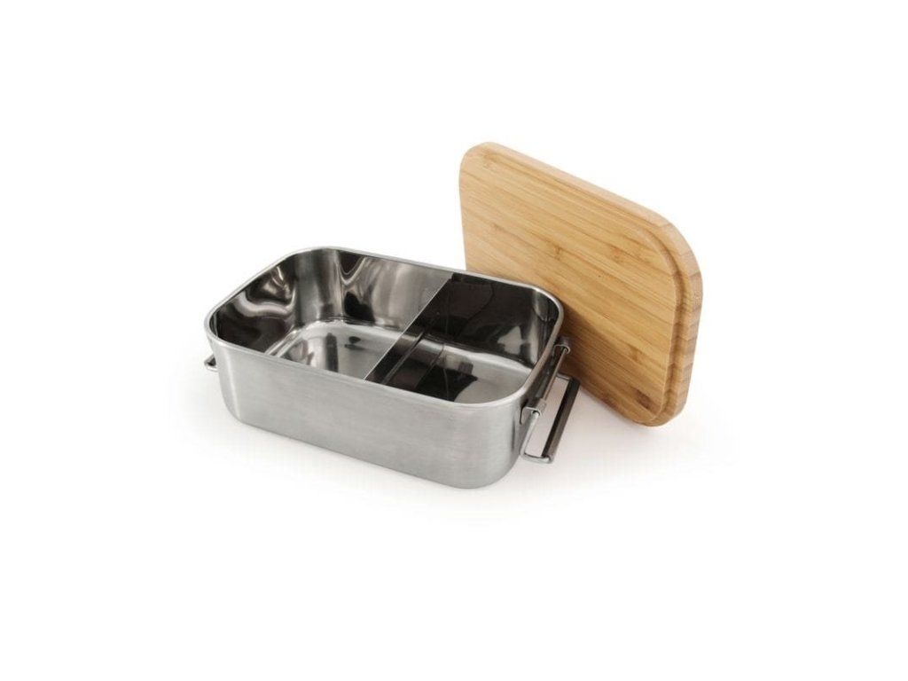 Kvalitná a odolná nerezová lunchbox dóza s objemom 1,2 litra, vybavená bambusovým vekom, ktoré možno použiť aj ako praktickú krájaciu dosku. Ideálne pre desiaty, obedy, outdoor, prácu aj školu.