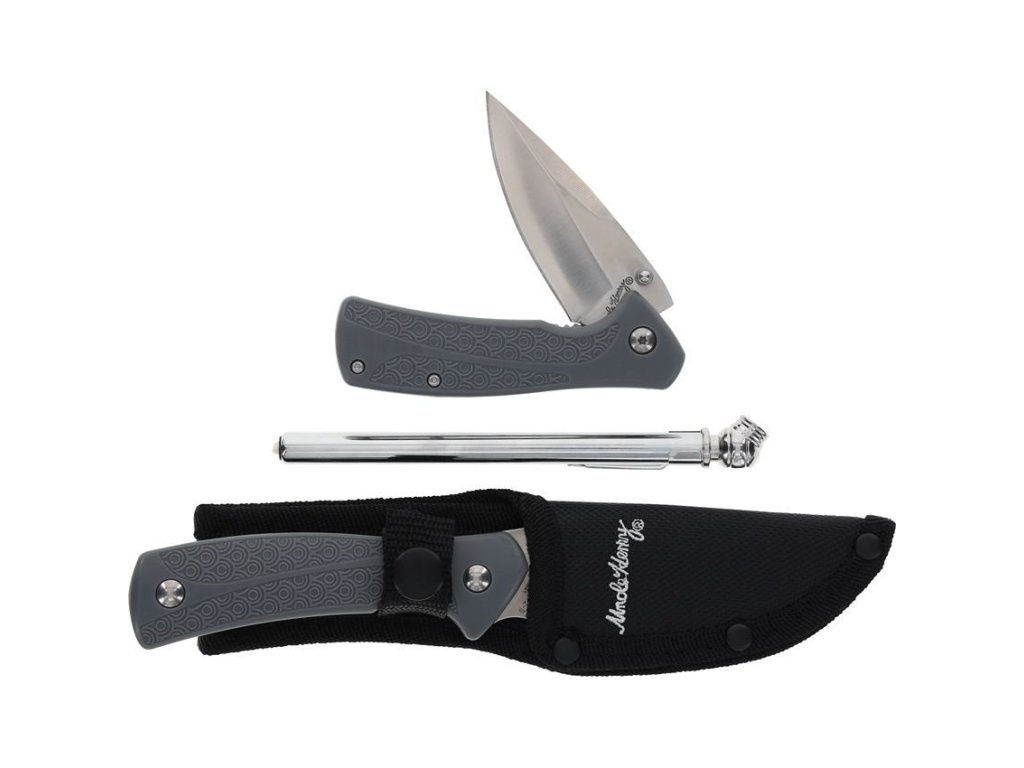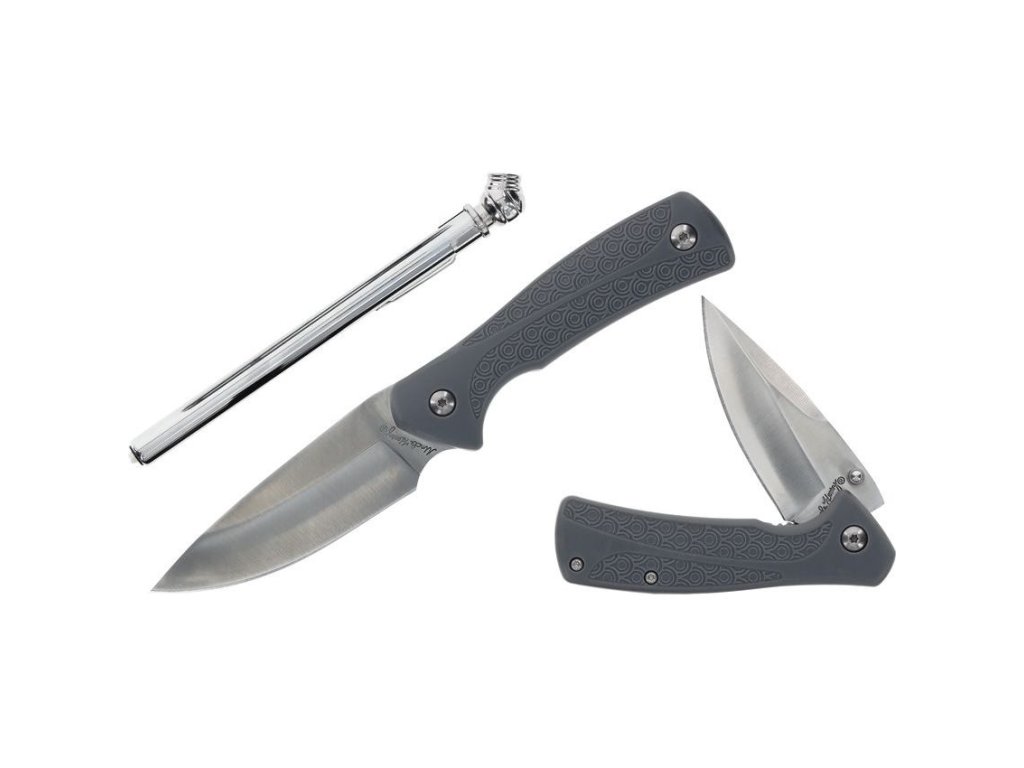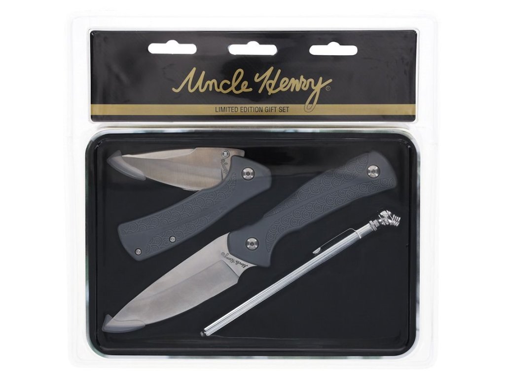 Sada zatváracieho noža, noža s pevnou čepeľou, puzdra a manometra v peknej plechovej darčekovej krabičke.