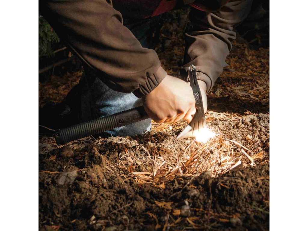 - Nylonová rukoväť vystužená sklom a omotaná paracordom so zabudovaným ferocerovým podpaľovačom.