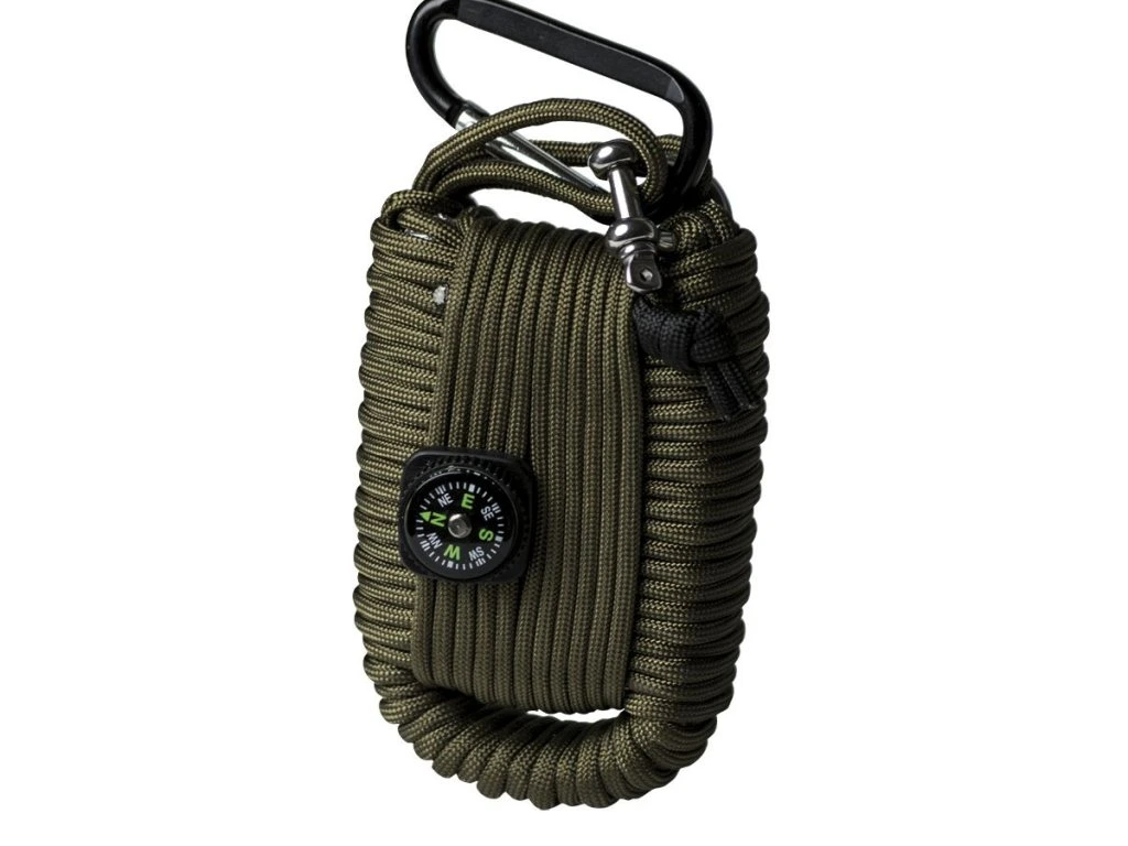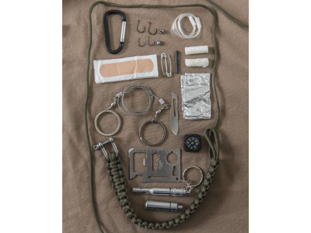 Originálna sada pre prežitie, ktora vám môže pomôcť v núdzi. Nájdeme v nej sadu na rybárčenie, na založenie ohňa, signalizácie. Vrátane polyesterového paracordu. Všetko je zabalené v praktickom balíčku, z ktorého pozerá kovová karabínka, takže sadu môžete pripevniť na batoh, vestu a pod.