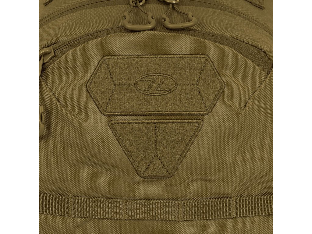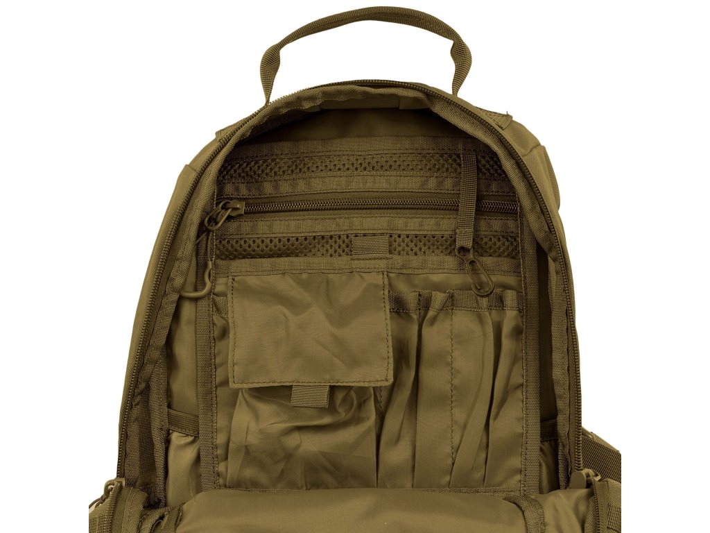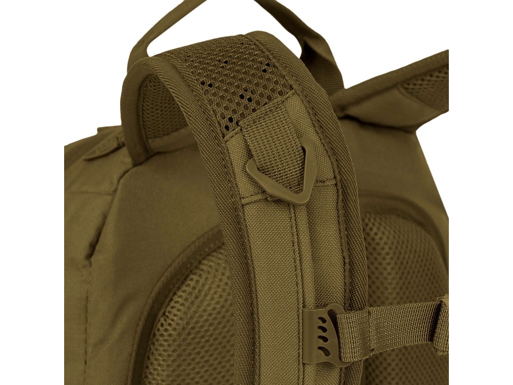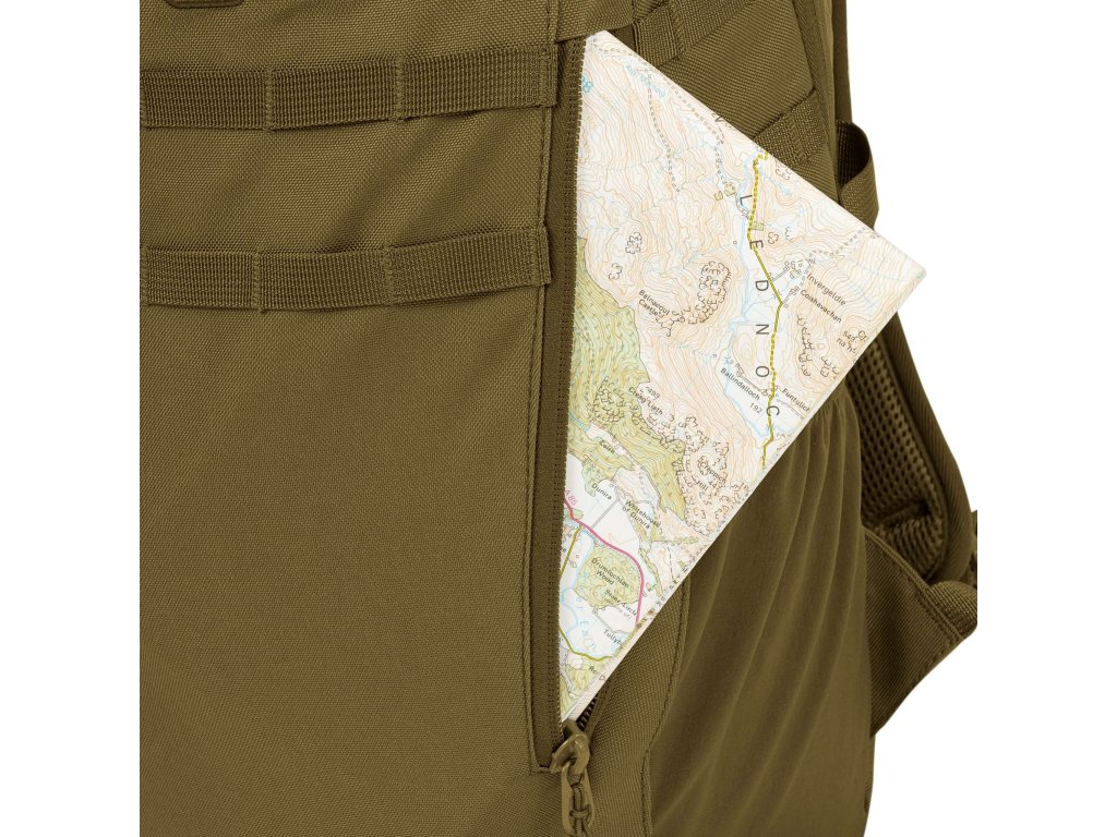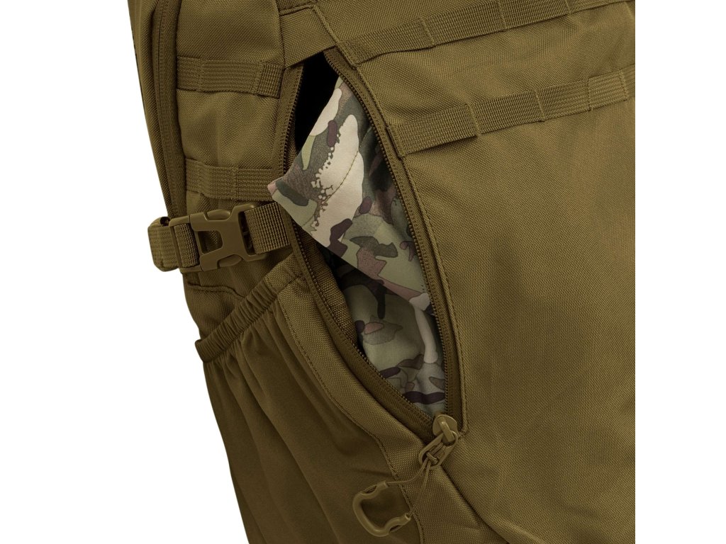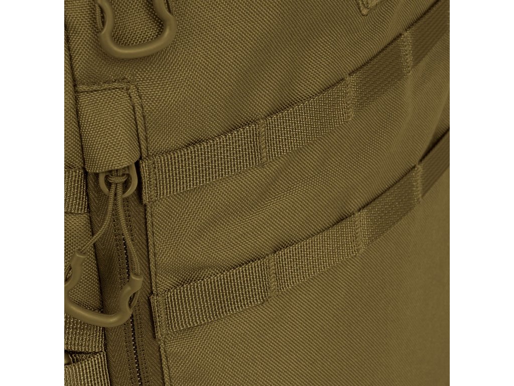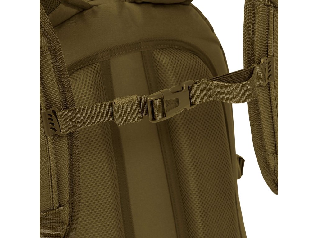 Chrbát plecniaka je bohato polstrovaný pomocou 3D sieťoviny, ktorej tvar zachováva stredový kanálik zlepšujúci odvetrávanie. Nosné popruhy sú nastaviteľné, polstrované, disponujú stabilizačnými popruhmi, plastovými trianglami a výškovo nastaviteľným elastickým hrudným popruhom, ktorý je spínaný plastovou prackou. Na bokoch batohu nájdete dva rady redukovanej MOLLE/PALS väzby, kompresné popruhy spínané plastovou prackou a elastické vrecká. Predná časť batohu je vybavená dvoma pruhmi MOLLE/PALS väzby, priestrannou stredovou priehradkou, vrchným vreckom a dvoma VELCRO panelmi.