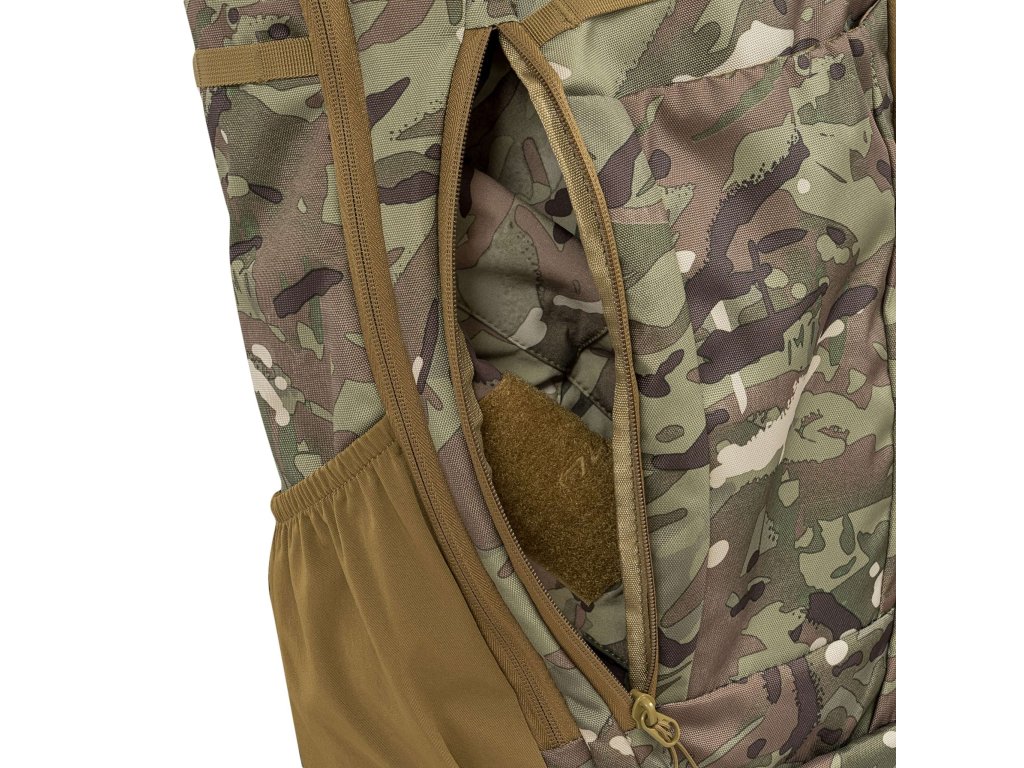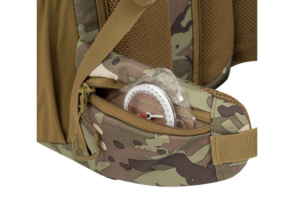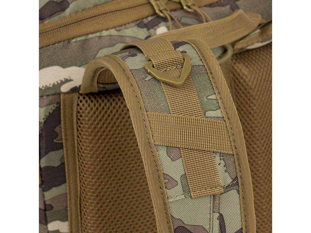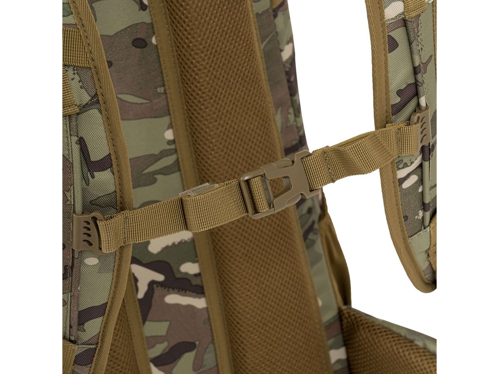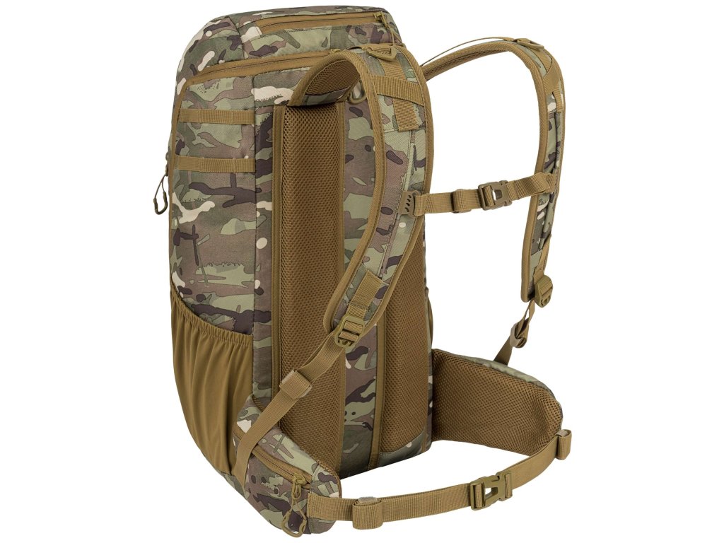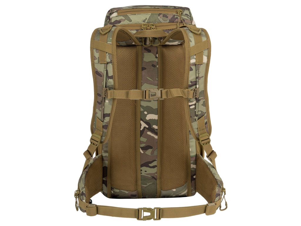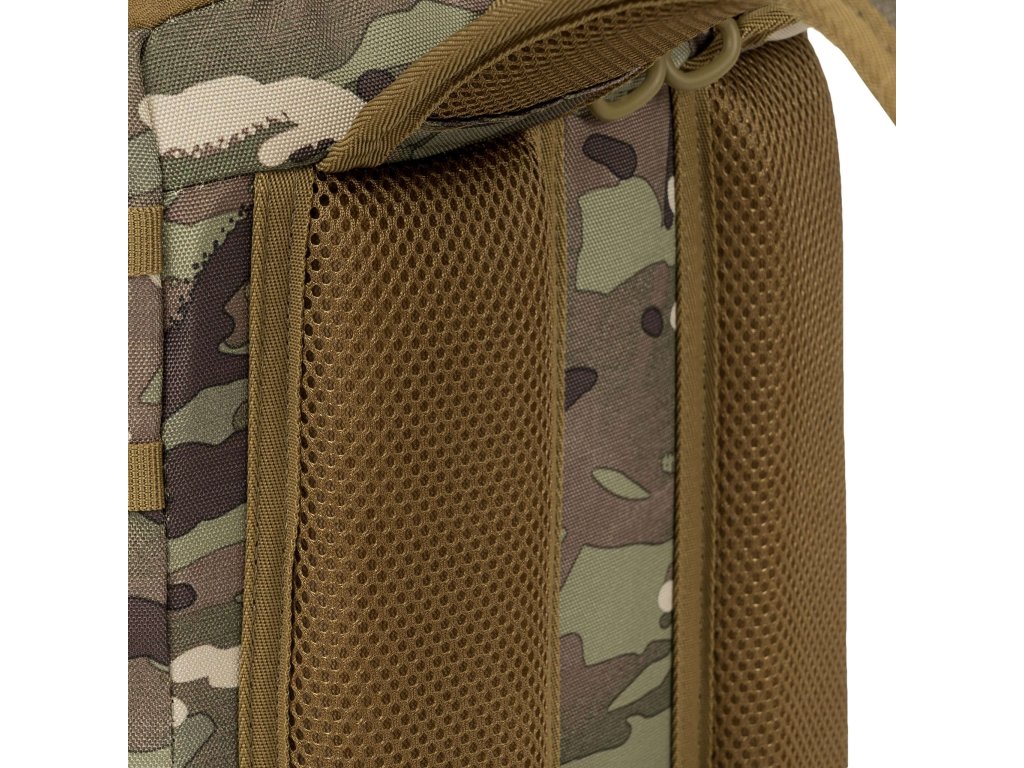 Chrbát plecniaka je bohato polstrovaný pomocou 3D sieťoviny, ktorej tvar zachováva stredový kanálik zlepšujúci odvetrávanie. V hornej časti chrbta nájdete klasické látkové madlo na prenášanie. Nosné popruhy sú plne nastaviteľné, polstrované, disponujú stabilizačnými popruhmi, plastovými trianglami, prievlakmi na pretiahnutie hadičky hydratačného vaku a výškovo nastaviteľným elastickým hrudným popruhom, ktorý je spínaný plastovou prackou. Bedrák batohu je čiastočne polstrovaný, spínaný plastovou prackou a na oboch stranách disponuje menšími vreckami uzatváranými zipsom. Na bokoch batohu nájdete tri rady redukovanej MOLLE/PALS väzby a elastické vrecká. Hlavná chlopňa batohu je vybavená pruhom MOLLE/PALS väzby, priestrannou stredovou priehradkou, vrchným vreckom a malým VELCRO panelom.
