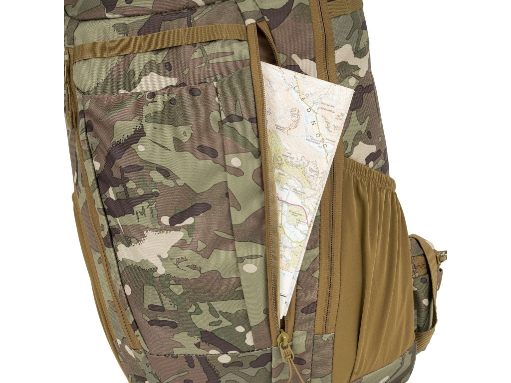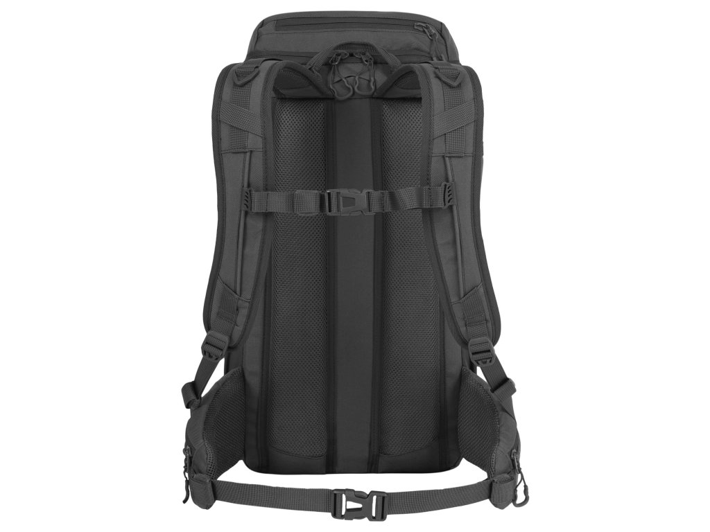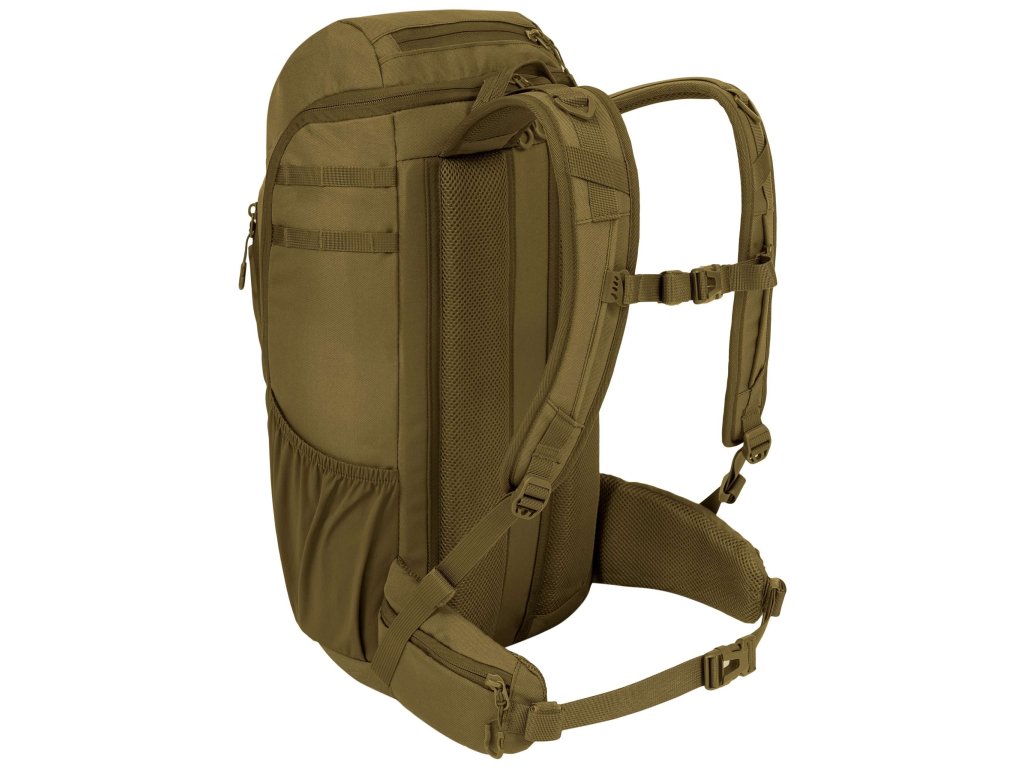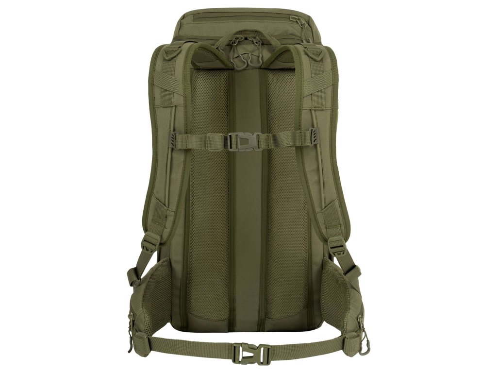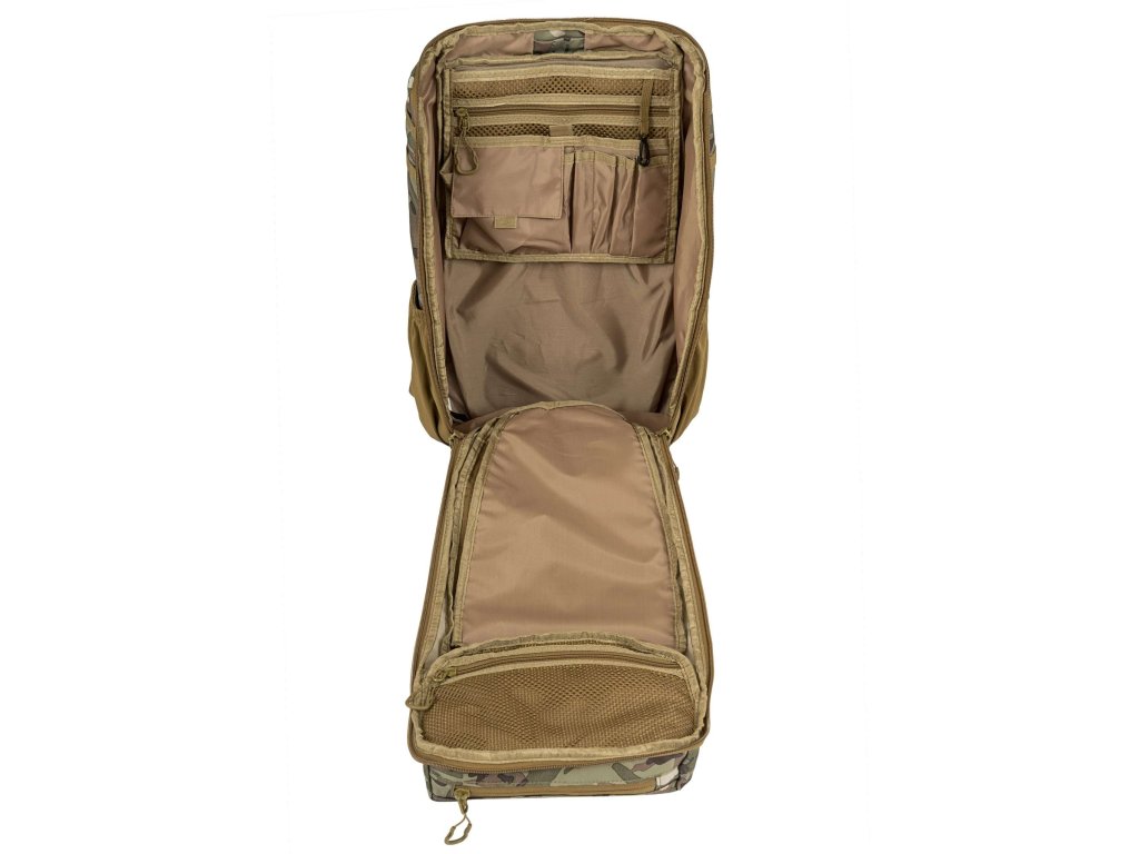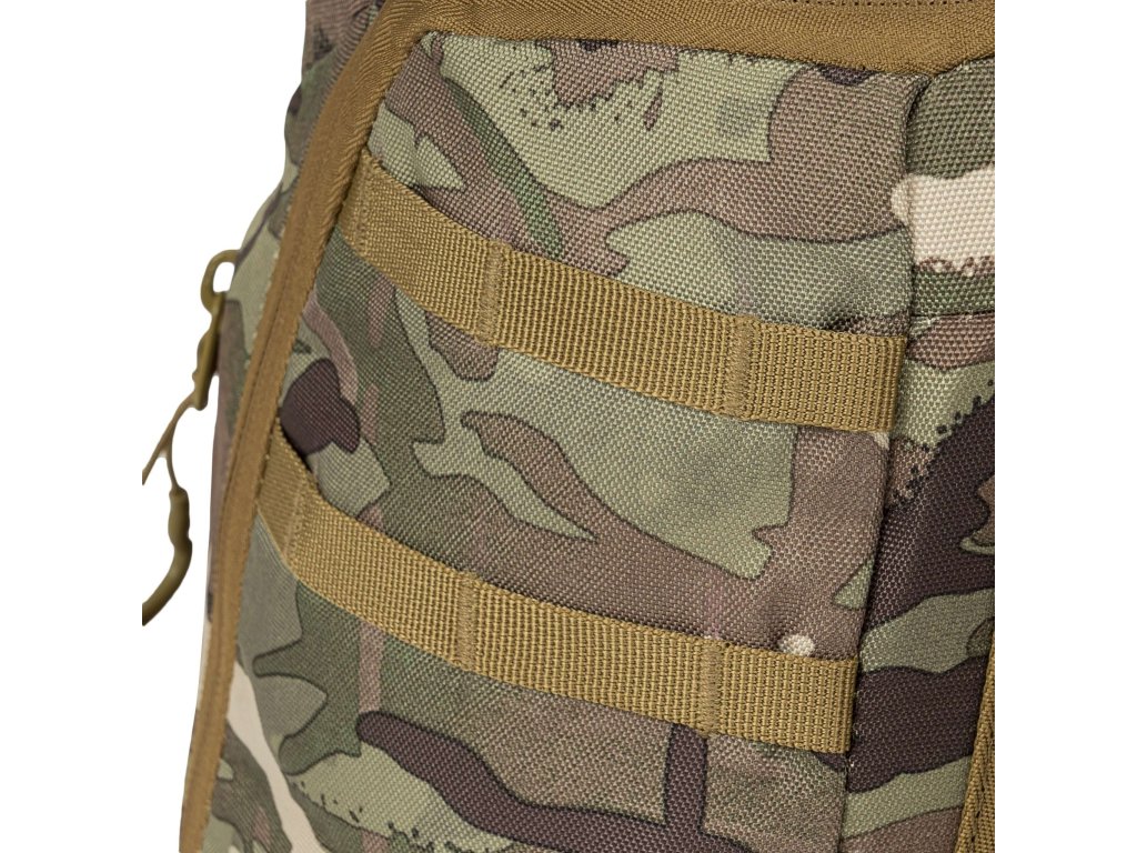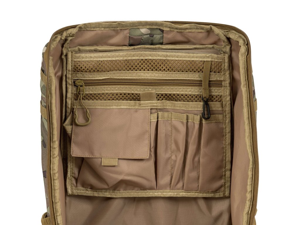 Chrbát plecniaka je bohato polstrovaný pomocou 3D sieťoviny, ktorej tvar zachováva stredový kanálik zlepšujúci odvetrávanie. V hornej časti chrbta nájdete klasické látkové madlo na prenášanie. Nosné popruhy sú plne nastaviteľné, polstrované, disponujú stabilizačnými popruhmi, plastovými trianglami, prievlakmi na pretiahnutie hadičky hydratačného vaku a výškovo nastaviteľným elastickým hrudným popruhom, ktorý je spínaný plastovou prackou. Bedrák batohu je čiastočne polstrovaný, spínaný plastovou prackou a na oboch stranách disponuje menšími vreckami uzatváranými zipsom. Na bokoch batohu nájdete tri rady redukovanej MOLLE/PALS väzby a elastické vrecká. Hlavná chlopňa batohu je vybavená pruhom MOLLE/PALS väzby, priestrannou stredovou priehradkou, vrchným vreckom a malým VELCRO panelom.